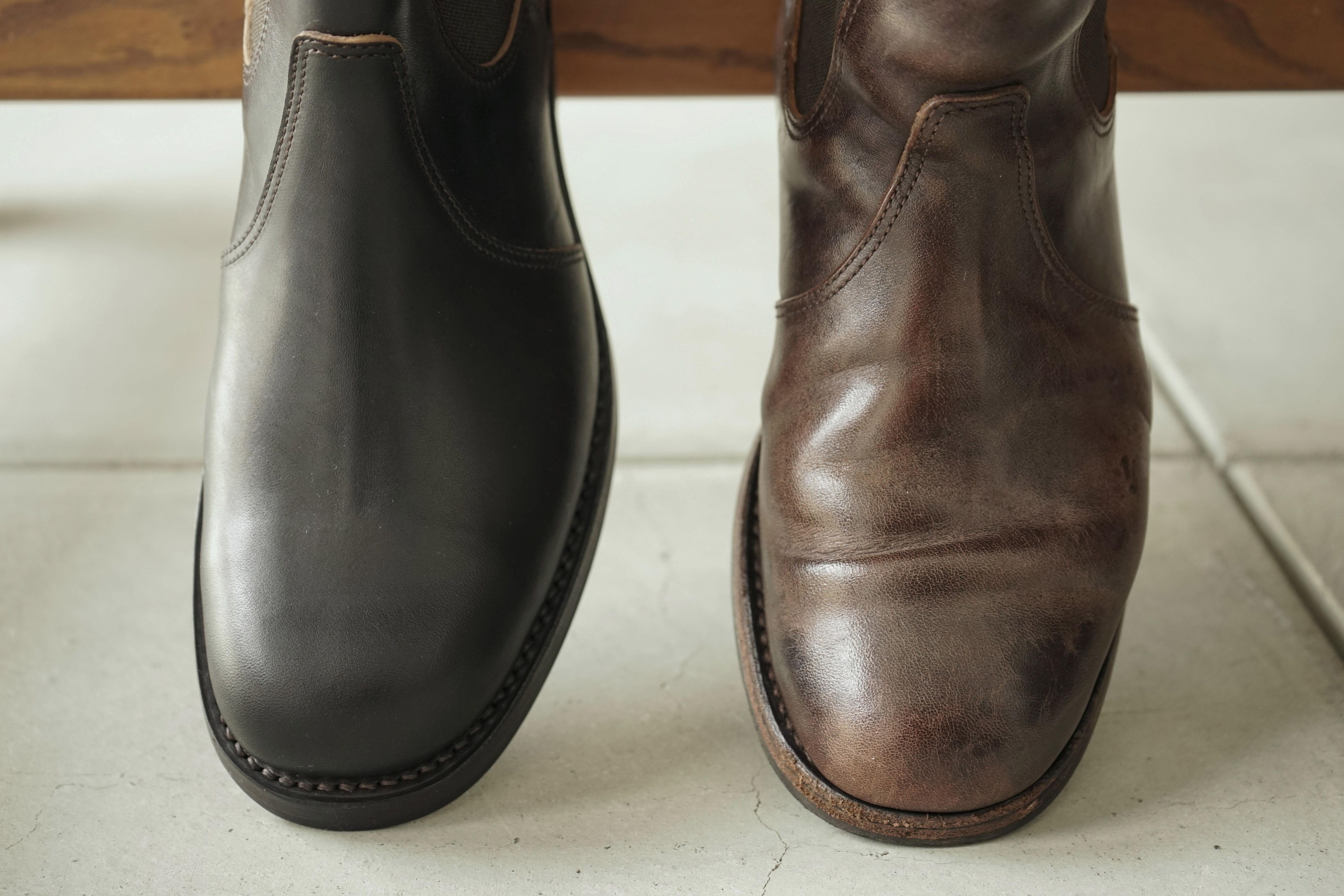 THE PERMANENTより、2色で展開しているSide-gore Boots。今回はその中でも、経年による表情の変化をより楽しめる「Vintage Black」にフォーカスしてご紹介します。未着用の状態ではマットで均一なブラックですが、履き込むことで少しずつ変化が現れます。表面に施された顔料が徐々に抜け、下地の色味がのぞくことで、ブラックの中にブラウンのニュアンスが混ざり合い、奥行きのある表情へと変化していきます。素材には、油分を豊富に含んだホースハイドを使用。繊維密度が高く耐久性に優れているため、多少の雨であれば気にせず履けるタフさも魅力の一つです。天候を選ばず日常的に履けるブーツだからこそ、紫外線や雨にさらされながらラフに履き込むことで自然な艶が生まれ、シワの入り方にも履き手それぞれの個性が表れていきます。約2年ほど着用した一足と未着用のものを並べると、その違いは一目瞭然。日常の中で履き込まれることで生まれたこの風合いは、同じものが二つとない、まさに唯一無二の表情です。未着用の状態が完成ではなく、使い込むことでより良くなっていくこと。それは、PHIGVELのものづくりにおいて大切にしている考え方の一つです。